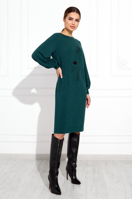 Платье прямого силуэта. Перед с нагрудными вытачками. Спинка со средним швом. Горловина лодочкой обработана планкой. Рукав одношовный втачной по низу со складками собранными на манжету-довяз. Украшением служит вышивка, расположенная по центру переда в районе груди. Длина платья: 99 см. Длина рукава: 60 см